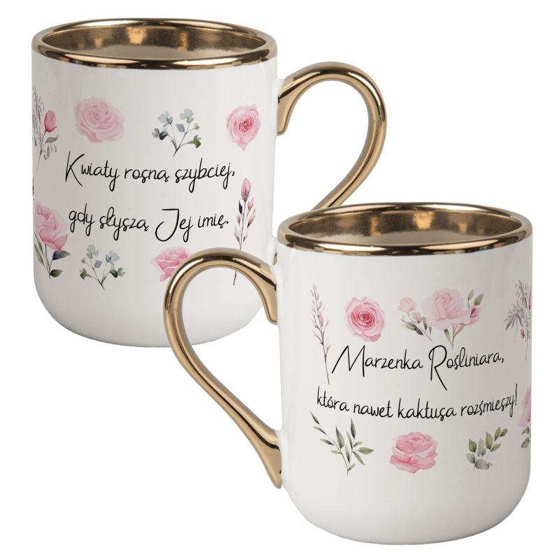 Nie zapomnij zapisać swojej personalizacji, aby móc dodać ją do koszykaKubek kawowy duży 330ml ze złotym uszkiem- "Rośliniara, która nawet kaktusa potrafi rozśmieszyć".