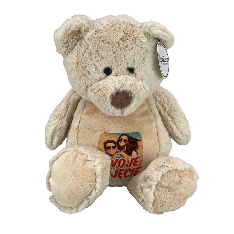 Beżowy miś ok. 32 cm z wyciąganym brzuszkiem oraz z Twoim zdjęciem tekstem czy grafiką.
