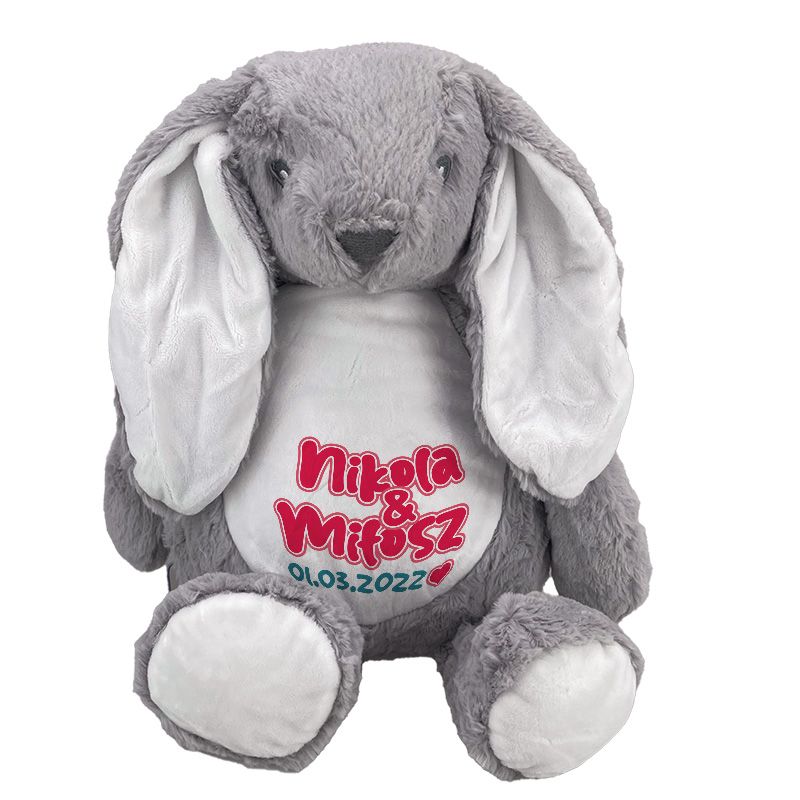 Królik ok. 34 cm z wyciąganym brzuszkiem oraz z imionami oraz ważną datą dla zakochanych, na ślub czy rocznicę.