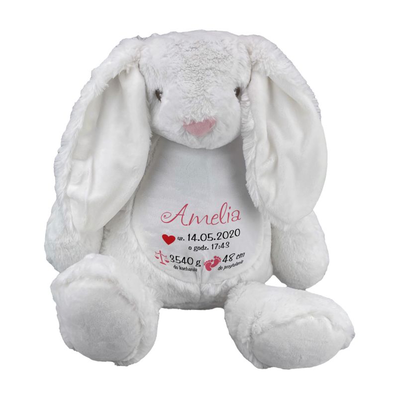 Królik ok. 34 cm z wyciąganym brzuszkiem oraz z nadrukiem "Metryczka"- różowy.