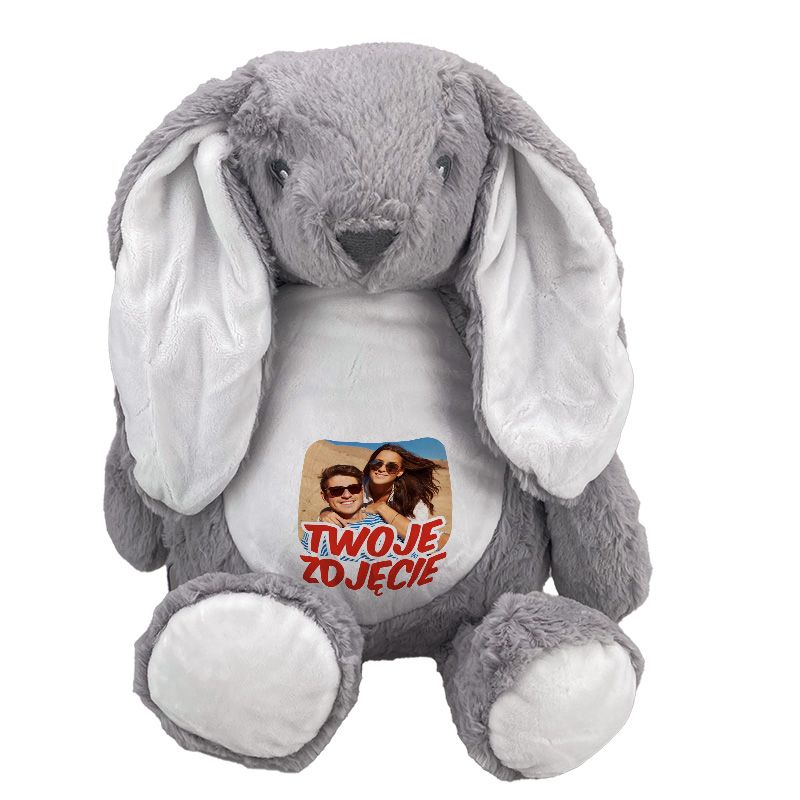 Szary królik z wyciąganym brzuszkiem oraz z Twoim zdjęciem tekstem czy grafiką.