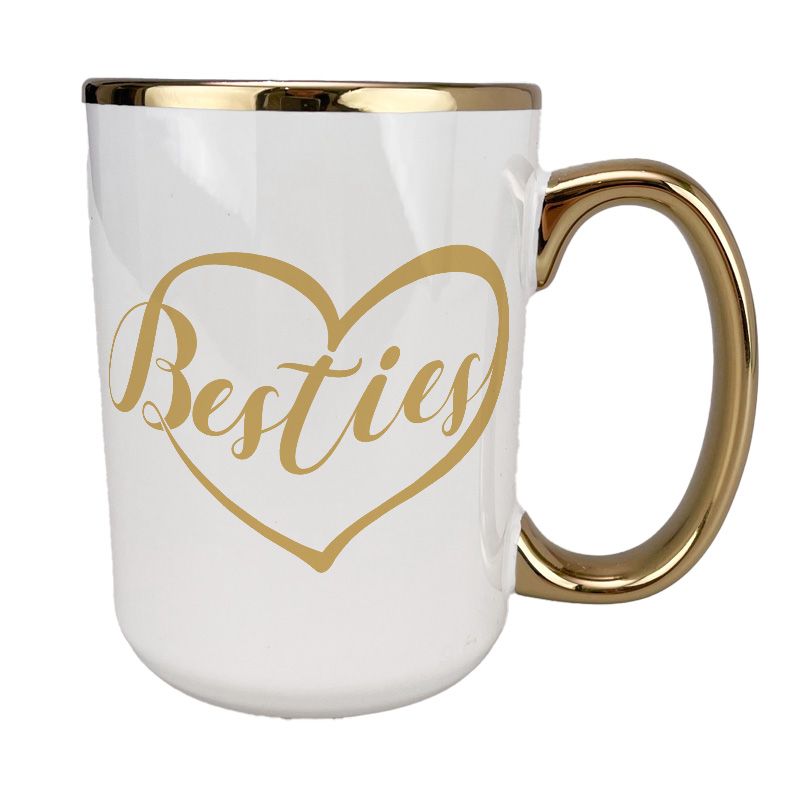 Kubek 450 ml biały ze złotym uszkiem, rantem oraz z grafiką "Besties".