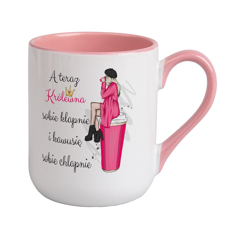 Kubek kawowy duży 330ml z kolorowym uszkiem i wnętrzem- A teraz Królewna sobie klapnie i kawusię sobie chlapnie..