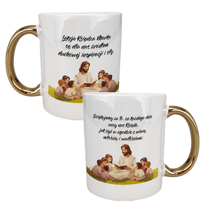 Kubek 330 ml biały ze złotym uszkiem oraz z grafiką "Kubek Księdza".
