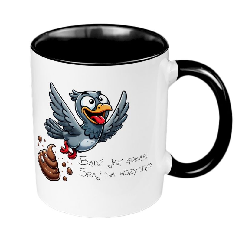 Kubek 330 ml kolorowy z tekstem "Bądź jak gołąb, sraj na wszystko".