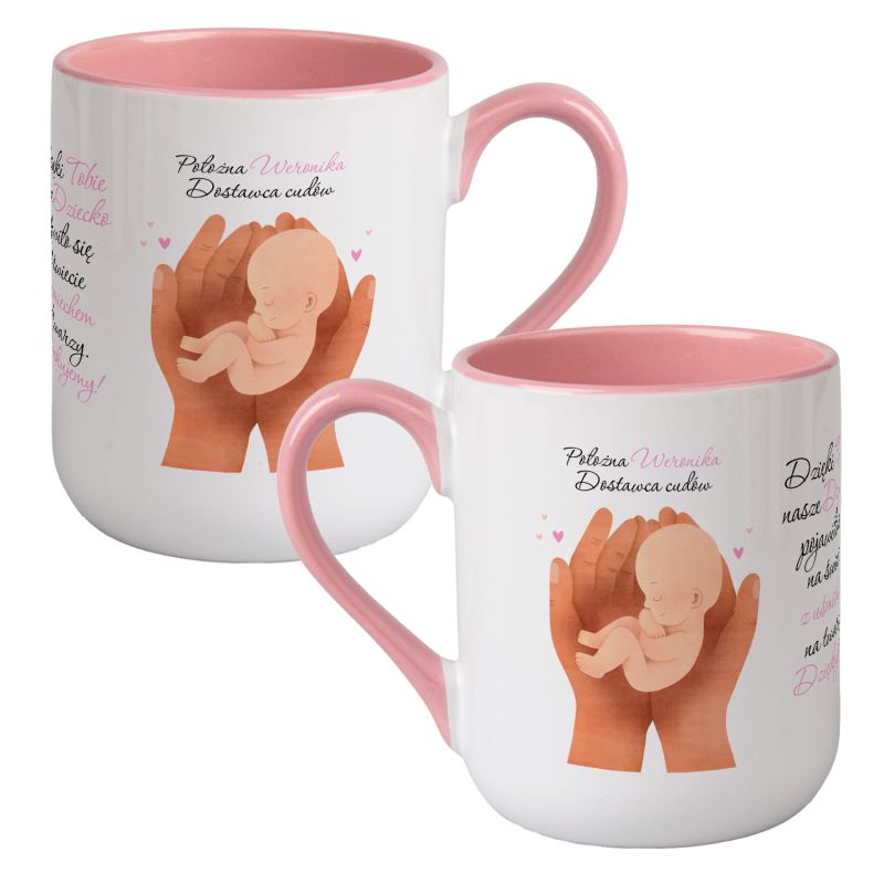 Kubek kawowy duży 330ml z kolorowym uszkiem i wnętrzem- prezent dla Położnej- "Dostawca Cudów".