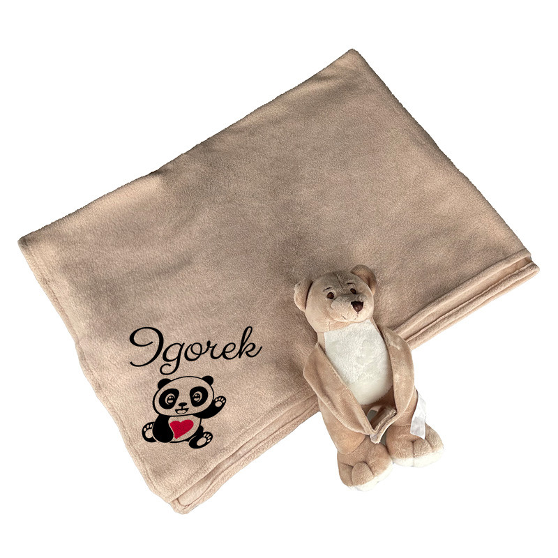 Miś trzymający koc między łapkami z imieniem dziecka- z okazji narodzin- panda.