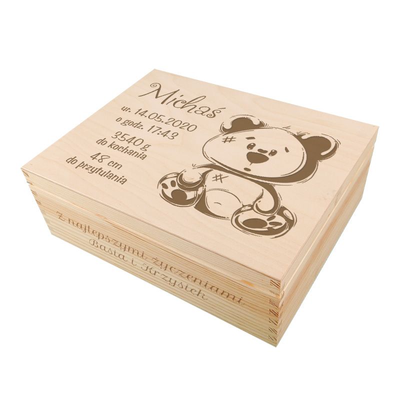 Świetna szkatułka z okazji narodzin dziecka. To prezent nie tylko dla Rodziców, ale i dla dziecka, ponieważ pamiątki, które zostaną tam schowane będą wszystkim przez lata przypominać pierwsze dni i lata maleństwa na świecie. Wewnątrz przegródki do umieszczenia przedmiotów związanych z narodzinami malucha- możesz kupić śmieszne gadżety sam, a też możesz pozwolić wypełnić je świeżo upieczonym rodzicom. Pudełko wyścielone jest wiórkami drzewnymi. Do pudełka pakujesz drobne gadżety i prezent z okazji narodzin, a zarazem pamiątka na całe życie gotowy.