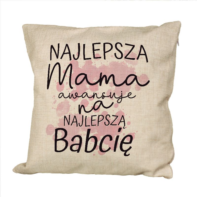 Poduszka lniana (imitująca len) "Najlepsza Mama awansuje na Najlepszą Babcię"- prezent z informacją o ciąży.