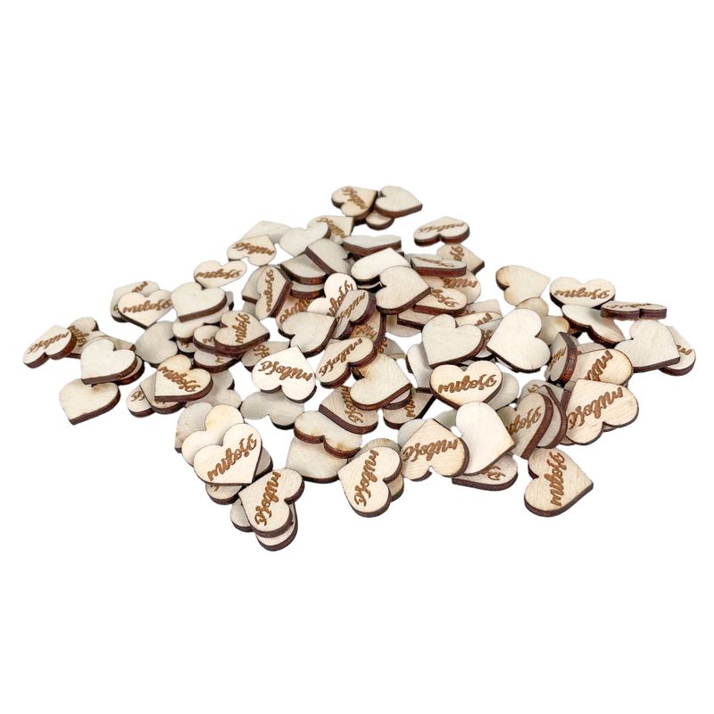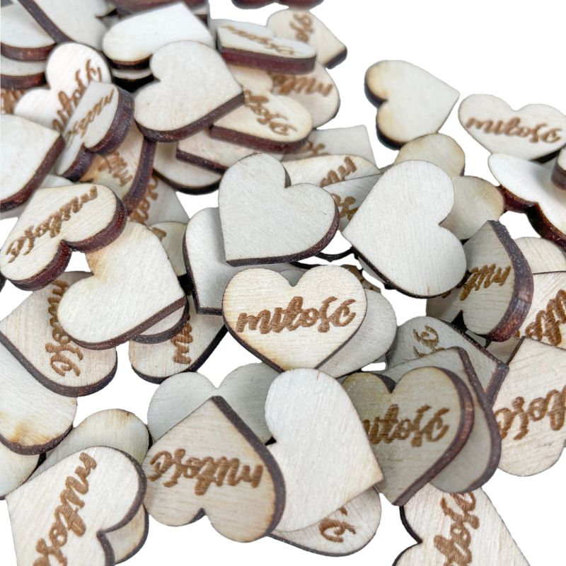 Dekoracyjne malutkie serduszka z napisem "miłość"- piękna dekoracja ślubna na słodki stół czy do Księgi Gości- eko ze sklejki.