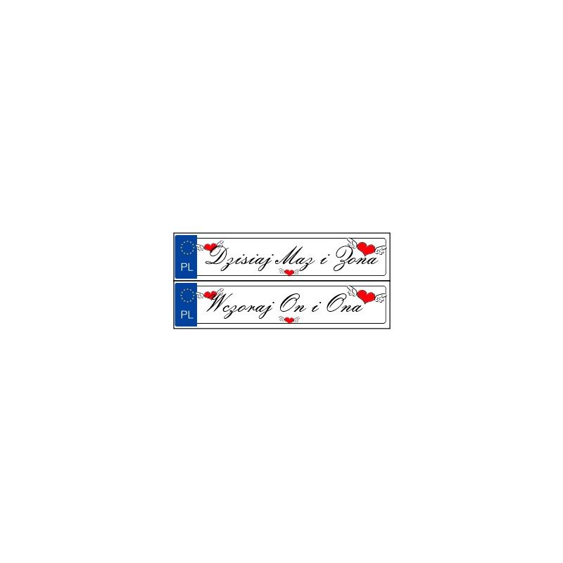 Zestaw tablic rejestracyjnych dla młodej pary "Wczoraj On i Ona, Dzisiaj Mąż i Żona".