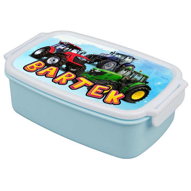 Pudełko na kanapki - śniadaniówka "Traktory"- wybierz swój wzór- pudrowa niebieska z zapięciami oraz przegródką.