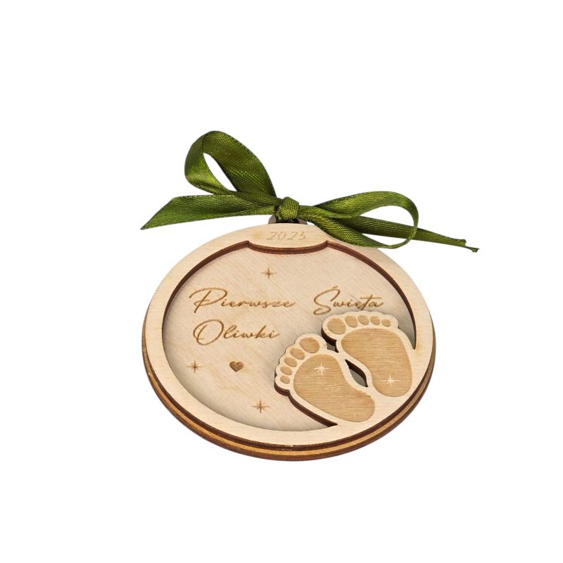 Nie ma nic bardziej wzruszającego niż pierwsze święta maleństwa! Ta piękna, personalizowana bombka z uroczymi stópkami i wygrawerowanym imieniem „Oliwka” to idealna pamiątka narodzin i magiczny dodatek na choinkę 💖✨