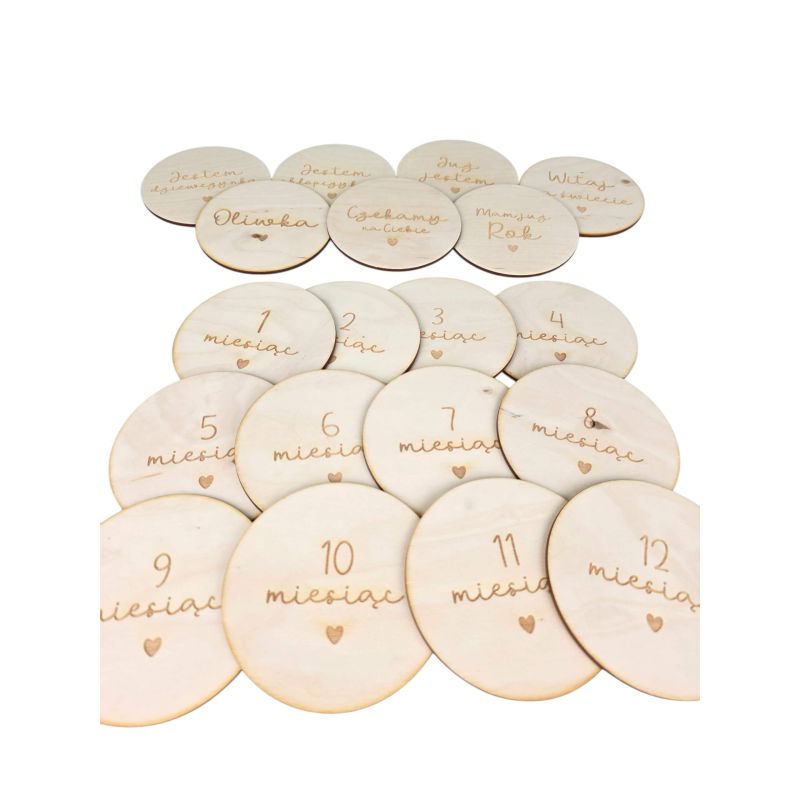 Nie zapomnij zapisać swojej personalizacji, aby móc dodać ją do koszykaDrewniane tabliczki miesiące dziecka 📸 personalizowane krążki 1–12 miesięcy + imię 🧸 zestaw do zdjęć niemowlaka
