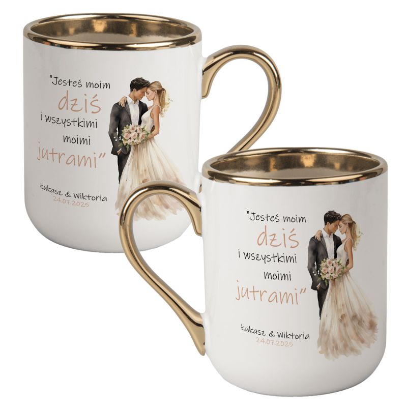 Ten elegancki kubek 330 ml z pięknym połyskiem w odcieniu złotym lub złoto-białym zachwyca swoim wyglądem i klasą. Romantyczna grafika przedstawiająca zakochaną parę w dniu ślubu podkreśla wyjątkowy charakter każdej miłości 💫