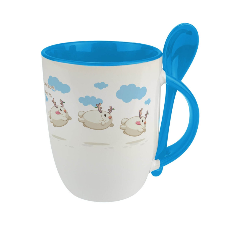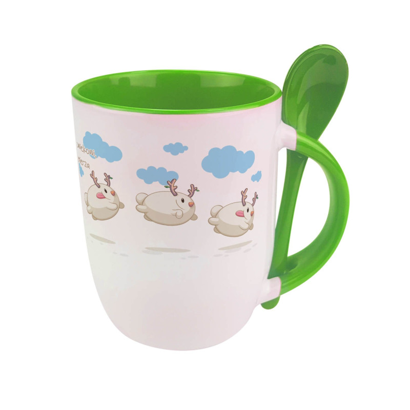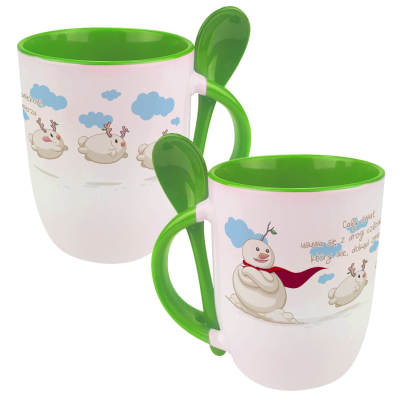 Kubek z łyżeczką, uroczymi bałwankami oraz motywującym tekstem.