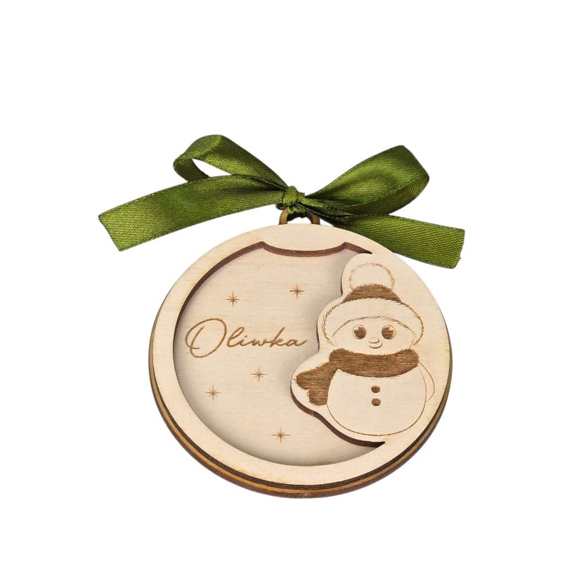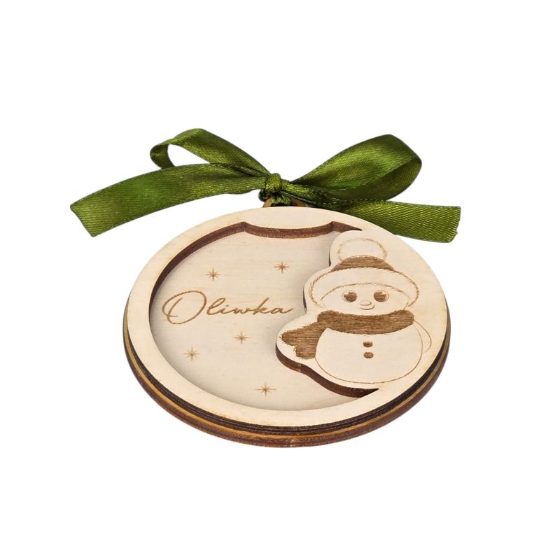 Personalizowana drewniana bombka świąteczna z bałwankiem – imię