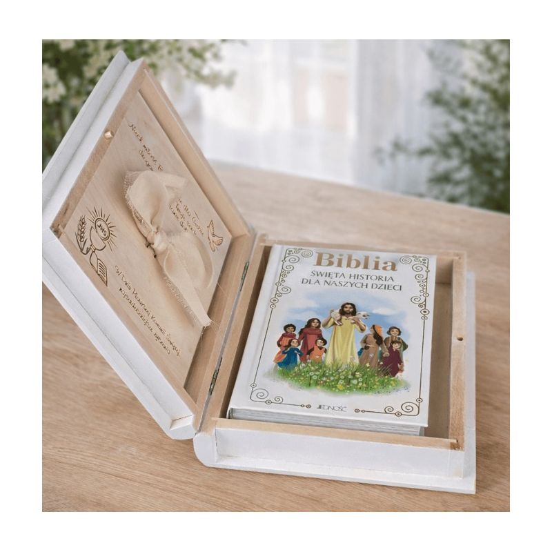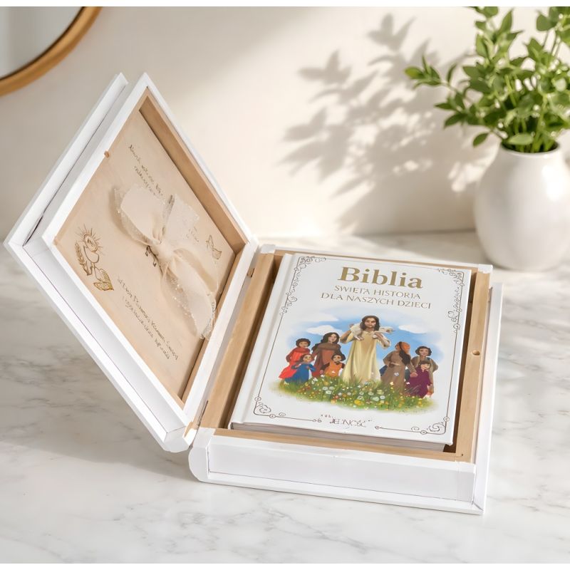 To eleganckie, personalizowane pudełko z Biblią dla dzieci to coś więcej niż zwykły upominek – to pamiątka na całe życie ✝️