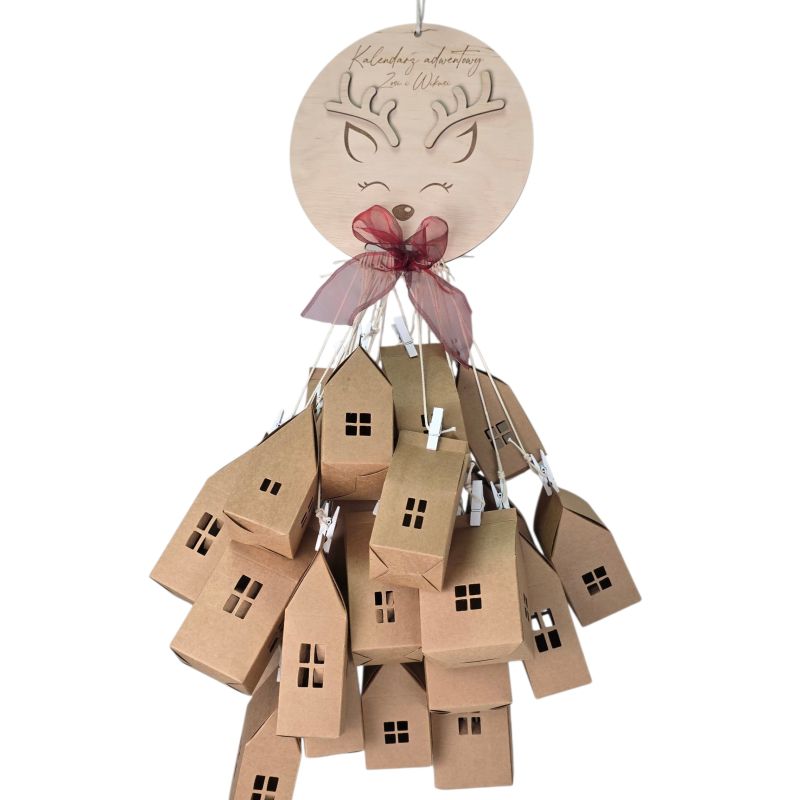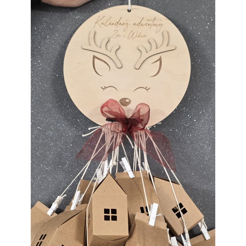 🦌 Drewniana baza o średnicy 20 cm przedstawia buzię renifera z personalizowanym grawerem imienia (np. „Kalendarz adwentowy Zosi i Wiktora”).