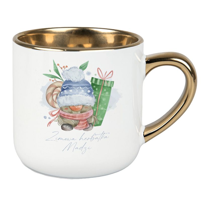 MediagrafUroczy kubek z zimowym motywem i personalizowanym napisem 🌨️ Idealny na herbatę, kakao lub kawę w chłodne wieczory 🎄 Złote wykończenie dodaje elegancji ✨