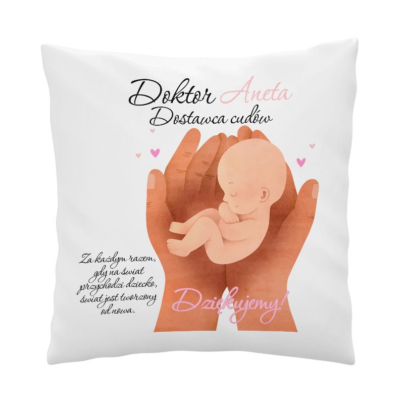 Mega uroczy prezent dla lekarza, położnej czy ginekologa, który pomógł przyjść na świat Waszemu maleństwu 👶💖. Na podusi grafika z rączkami trzymającymi dzidziusia i wzruszający tekst 🥹.