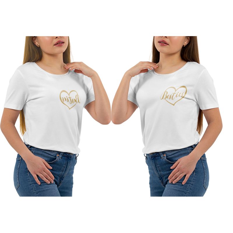 Nie zapomnij zapisać swojej personalizacji, aby móc dodać ją do koszykaZestaw koszulek dla przyjaciółek czy sióstr "Besties"- złoty.