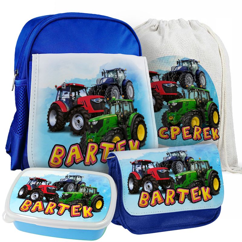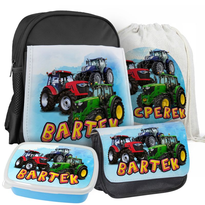 Zestaw szkolny z grafiką "Traktory" - plecak, worek, piórnik, śniadaniówka- wszystko co potrzebne do szkoły.